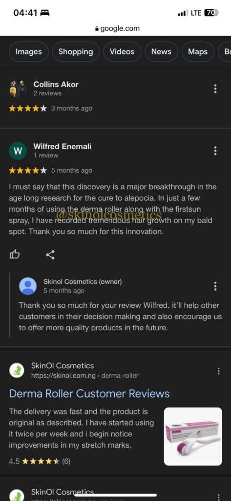 I must say that this discovery is a major breakthrough in the age long research for the cure to alepocia. In just a few months of using the derma roller along with the firstsun spray, I have recorded tremendous hair growth on my bald spot. Thank you so much for this innovation.