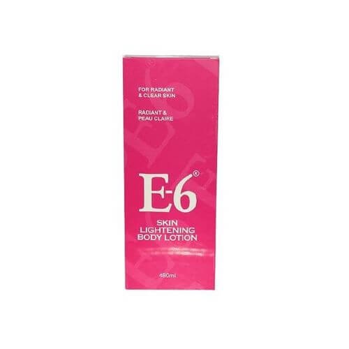 Product detailsE-6 body brightening lotion, makes the skin light and also ensures you have a uniform skin complexion.Product size: 480mlBrand: E-6Age Range: AdultsSkin type: AllTo be used: BodyTexture: LotionWhat it does?Made with very active ingredients, this lotion acts on the skin, nourishing, moisturizing and causing the skin complexion to appear the same color. In other words, it is a corrective lotion that helps reverse the effect of harmful creams such as bleachers, on the skin. It leaves you with a glowing youthful look. It also contains anti-aging minerals that helps you maintain a clear and wrinkle-free smooth body. No harmful substance is contained in this lotion.BenefitsIts bits of help lighten the Skin with innovative natural skin lightening agents.Ideal to lighten dark discoloration such as age sports, Liver spots, and freckles.For Radiant & Clear SkinSide EffectsNoneHow to useApply a good amount to skin and massage gently until absorbed.