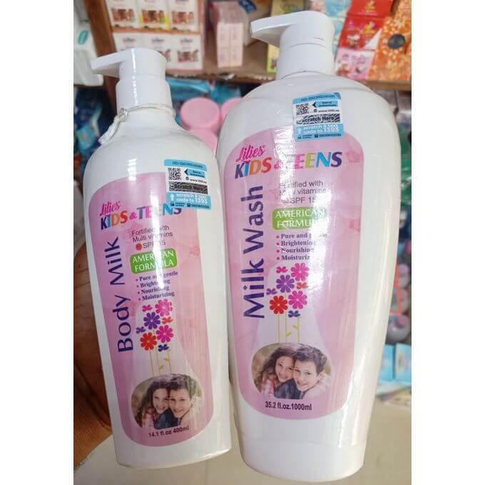 Lilies kids and teens milk wash with milk extract is soft and tender to the skin. It effectively nourishes and deeply cleanse the skin of excess oil and dirt. Its extra moisturizing essence leaves the skin feeling soft and comfortable and silky smootha after use. 35.2fl. oz. 1000ml Fortified with multi vitamin spf 15. Pure and gentle, Moisturizing, Brightening, Nourishing. How to use: Wet body with warm water, apply lilies Kids and teens milk wash with your hands or wash cloth, gently lather rinse and snuggle. Every drop goes along way to refresh,rejuvenate and reveal a healthy brighter glowing complexion . Lilies Kids and teens body milk gives your body daily rejuvenation, Moisturizing with Mild skin brightening enhancers. Enriched with glycerine and vitamin B3 to leave skin soft, smooth and beautiful. 14.1fl.oz. 400ml How to use: apply evenly on the skin after bathing and allow to dry healthy glowing skin will develop.
